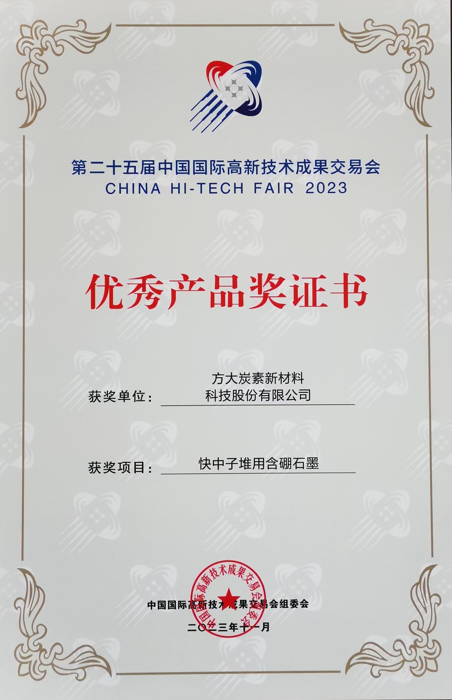 方大炭素快中子堆用含硼石墨產品榮獲第二十五屆高交會優秀產品獎